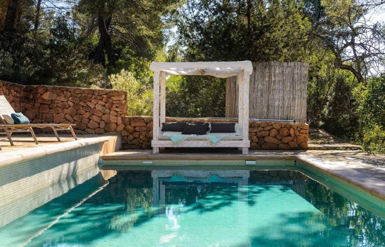 Una finca rural de estilo ibicenco situada en una zona tranquila rodeada de árboles frutales y pinos, cada uno con su propio espacio natural e intimidad. Un gran patio te espera en la entrada de la villa, que está decorada con una gran mesa de madera para comer al aire libre y zonas de relax. Desde el patio accedes al salón comedor, la cocina y 2 de los dormitorios.